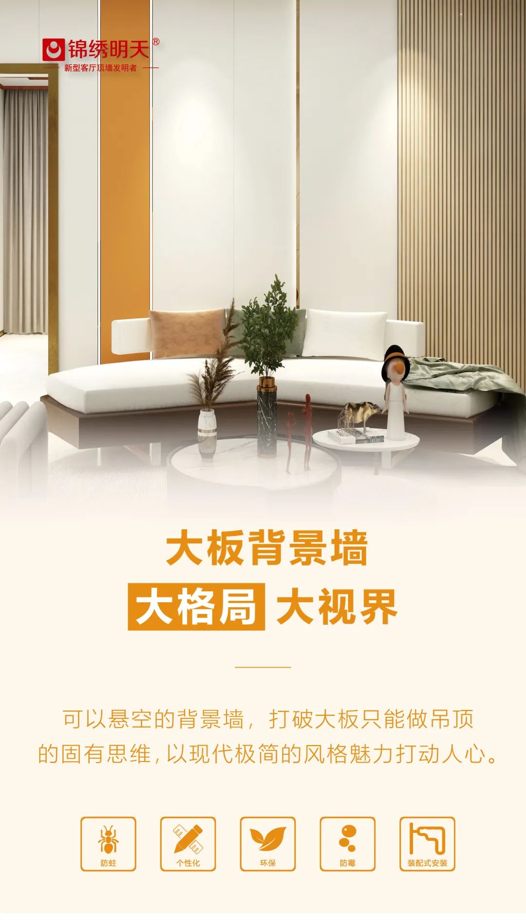 锦绣明天专注于高端客厅全铝吊顶和背景墙的研发和制造,多年来为80000+客户提供了顶墙方案。今天,不谈全铝吊顶。主要跟大家谈谈咱们家备受用户青睐的全铝背景墙,个性定制,装上它,让您的家随意百搭,人见人爱!