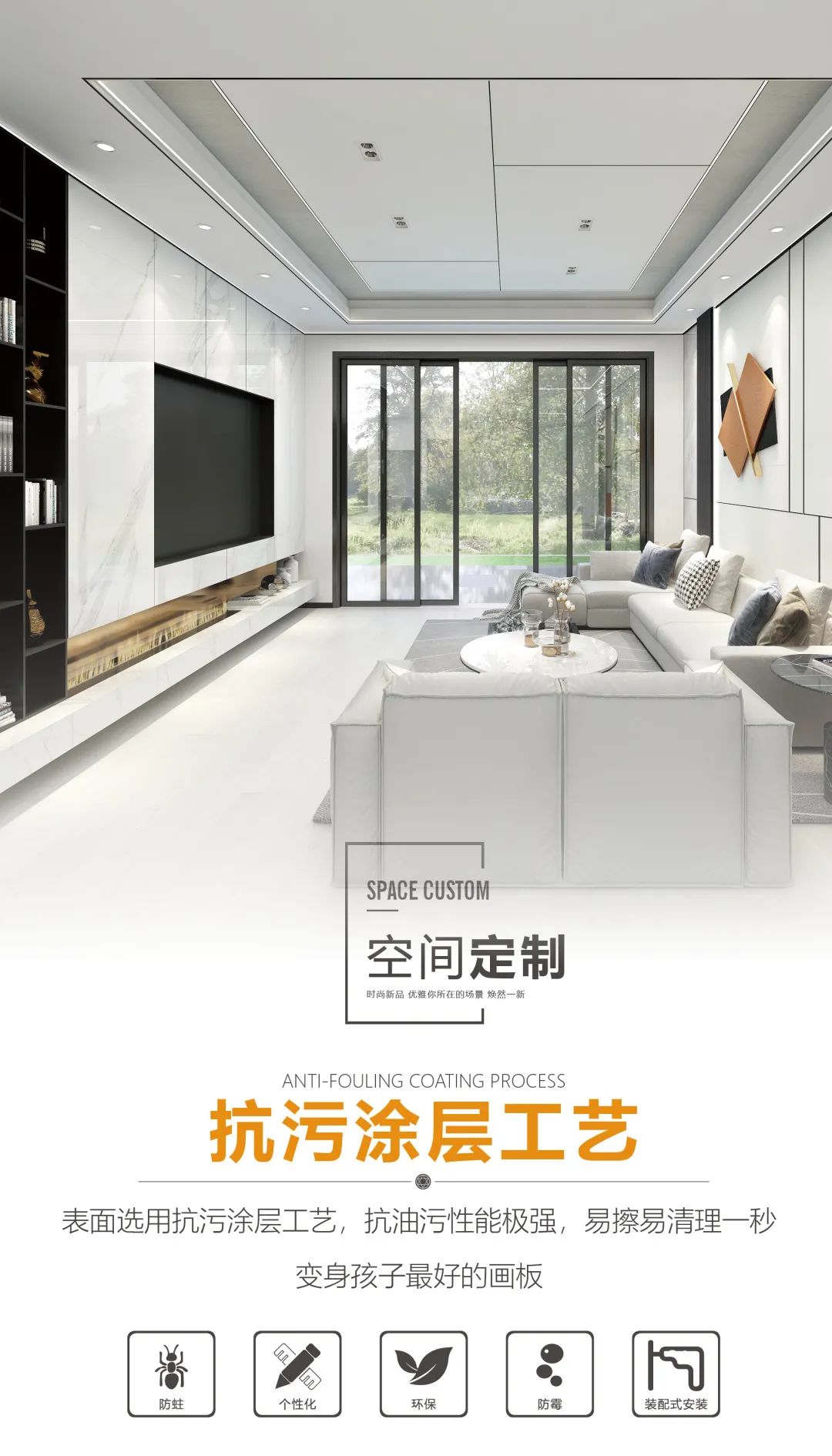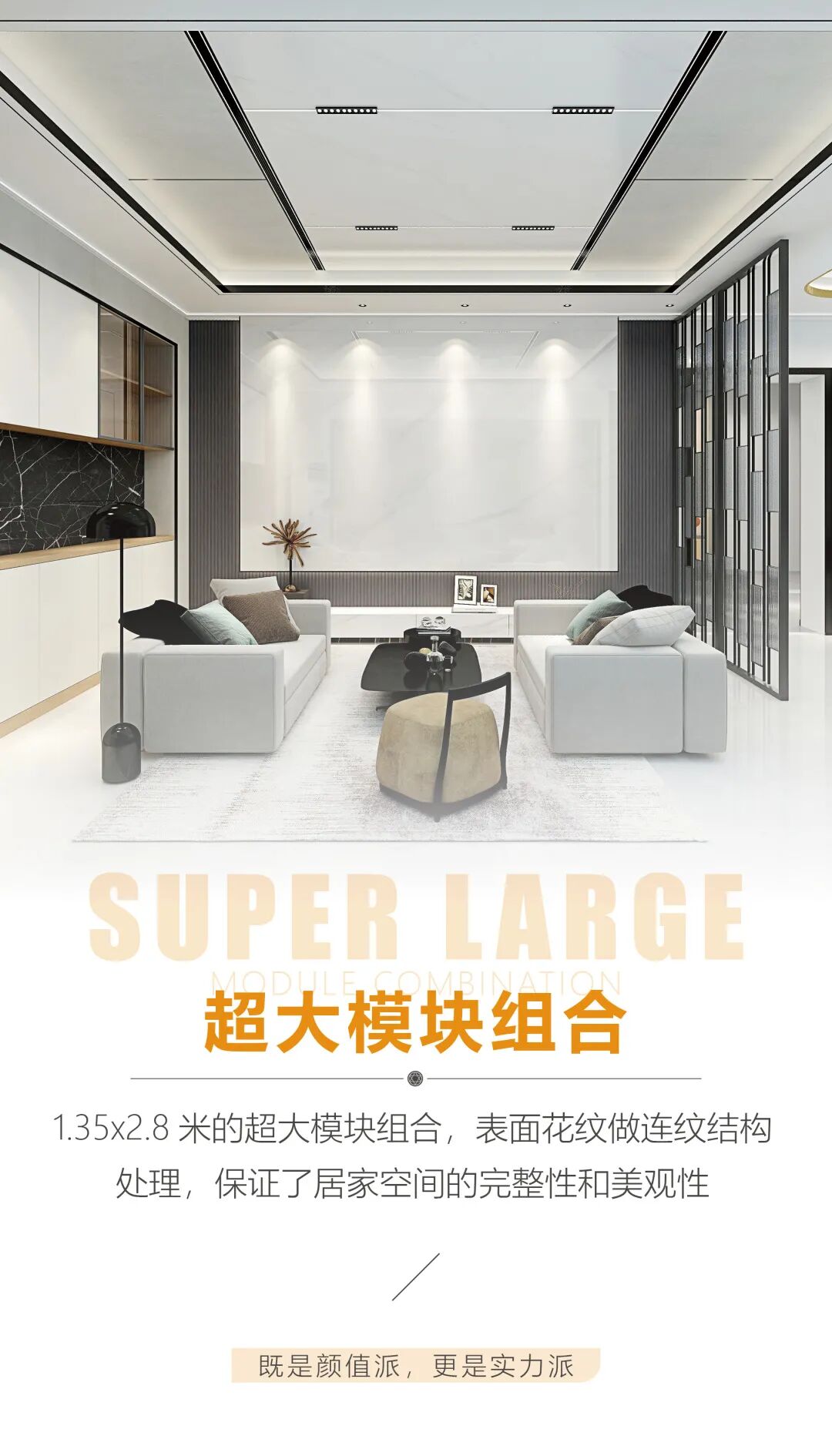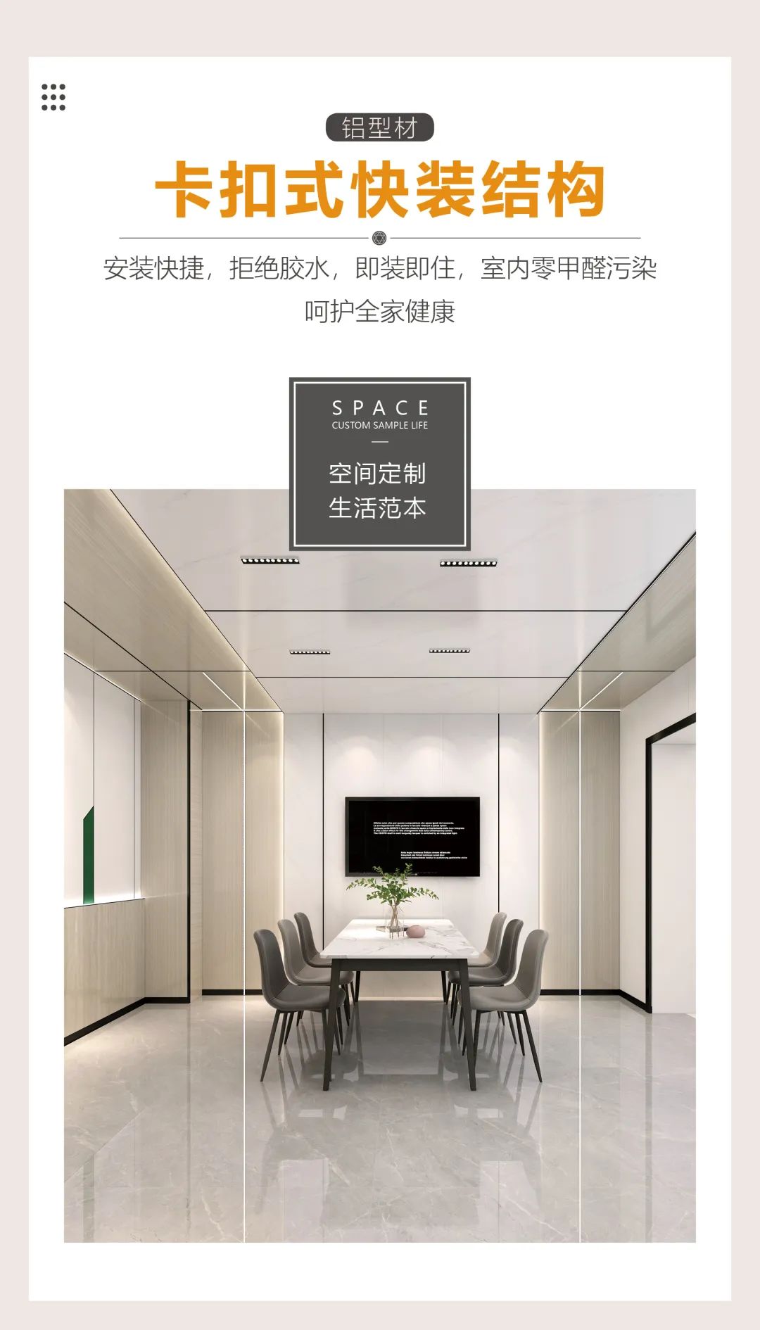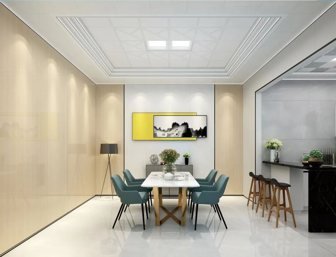 说到环保材料,不得不提的就是铝,铝吊顶、铝墙面、铝柜子、铝家具……铝早已被全面应用到家居产品中,是公认的家居环保材料。客厅用全铝吊顶和背景墙,不但美观雅致,时尚环保,十年不过时!