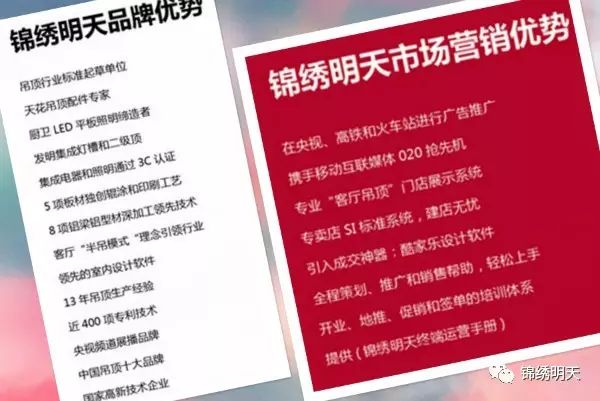 锦绣明天专注吊顶十三年,以“中国十大吊顶品牌”、“央视频道展播品牌”、“消费者喜爱吊顶品牌”享誉业内外,同时作为国家高新技术单位,担负做世界**的人居美学领航者重任,不断助推客厅吊顶行业快速发展。如今以“客厅吊顶高端品牌”已经深入全国消费者心中,品牌效应和营销策略将惠及全国锦绣明天经销商。