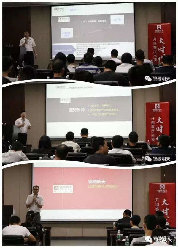 在“开创客厅吊顶大时代”为主题的招商会上,锦绣明天执行总监黄远林,以锦绣明天十三年的发展历史与技术沉淀为背景,讲述了锦绣明天自2004年「发展历程简介和战略规则」,有锦绣明天顶墙构件事业部运营总监胡龙洋介绍公司「产品规划与简介」,还有来自锦绣明天品牌运营事业部总监罗辉权与大家分享公司「品牌战略规则及实施」,以及交流自己创办锦绣明天南海专卖店的成功经验,赢得了在场意向客户的阵阵掌声。